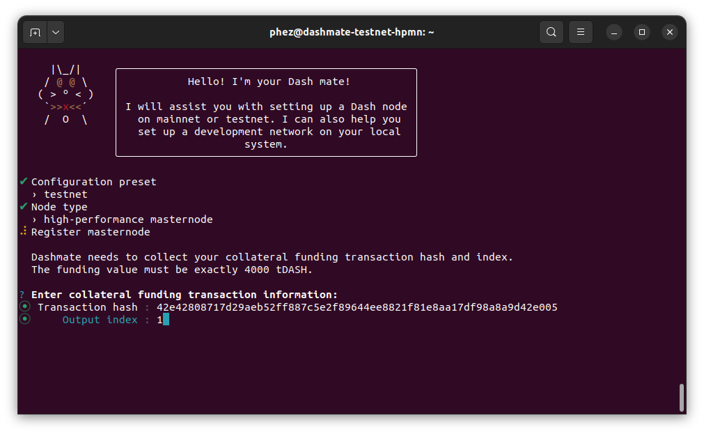 To begin masternode setup, run dashmate setup to start the interactive wizard: