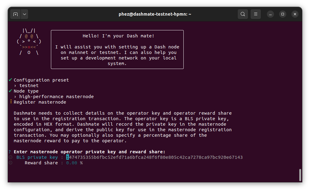 Enter an operator BLS private key. You can enter one you have created (e.g. using Dash Core) or received from a hosting provider. Optionally, use the one automatically generated by dashmate.