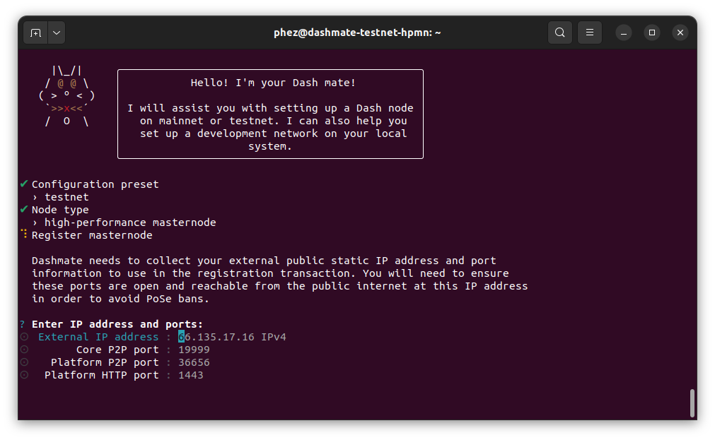 Dashmate will automatically detect the external IP address and select the default ports for the network you are setting up. You can modify these values if necessary for a specific reason, but typically the defaults should be used.