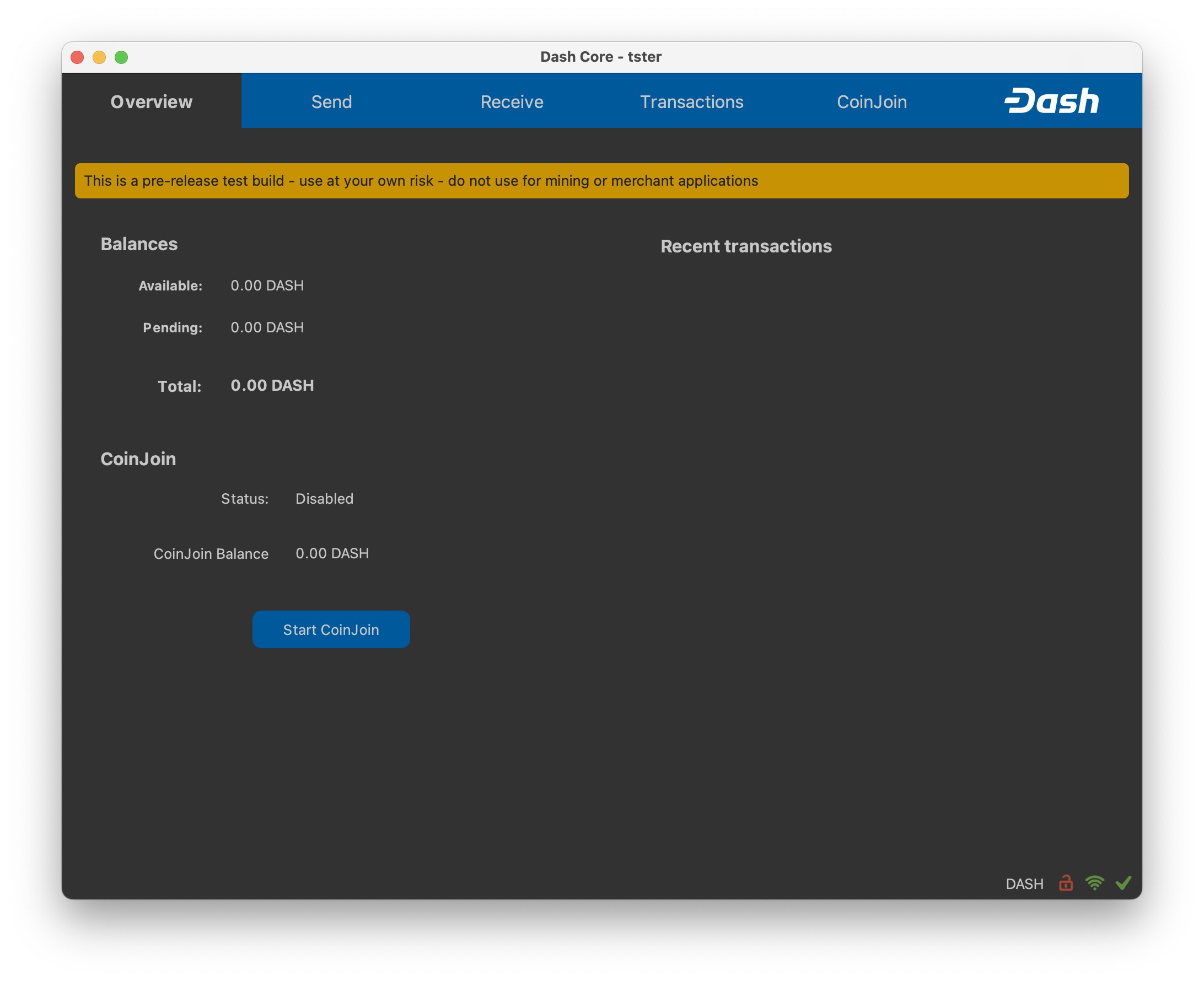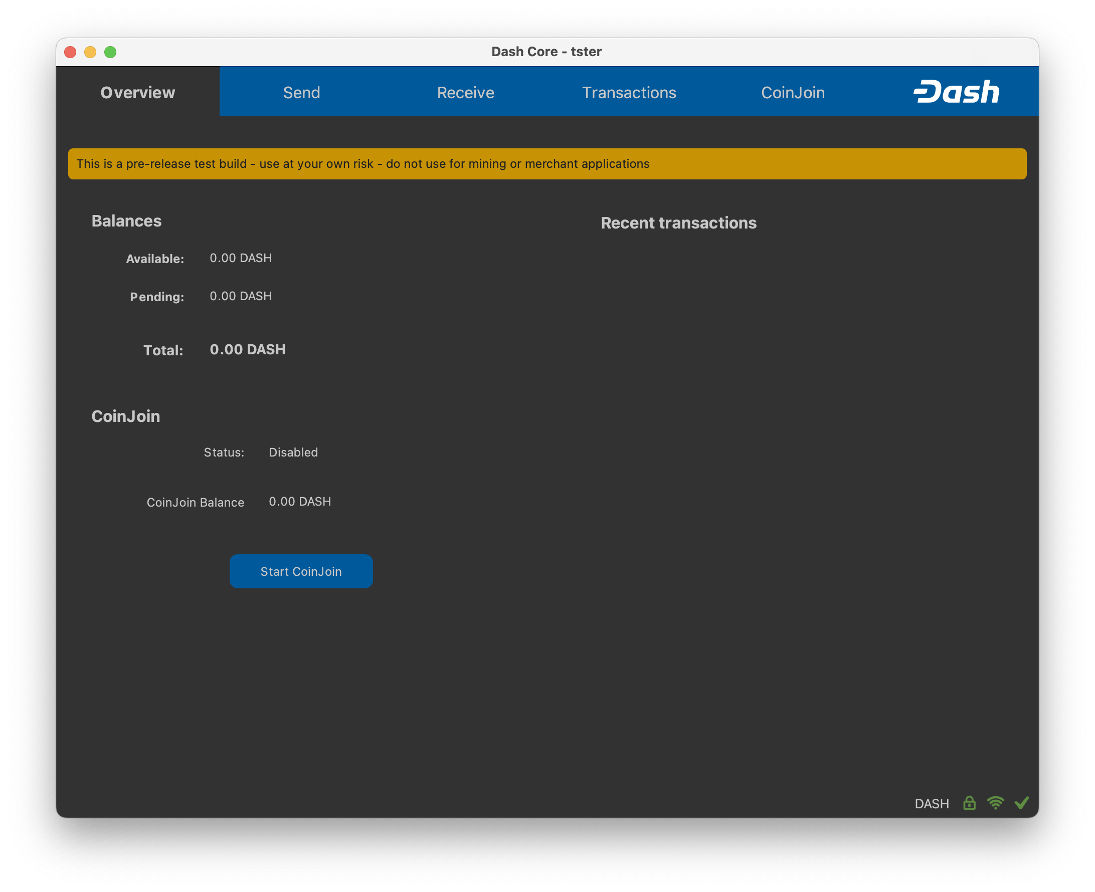 Once Dash Core is successfully installed and started, you will see the wallet overview screen. The status bar at the bottom of the window will show the synchronization progress.