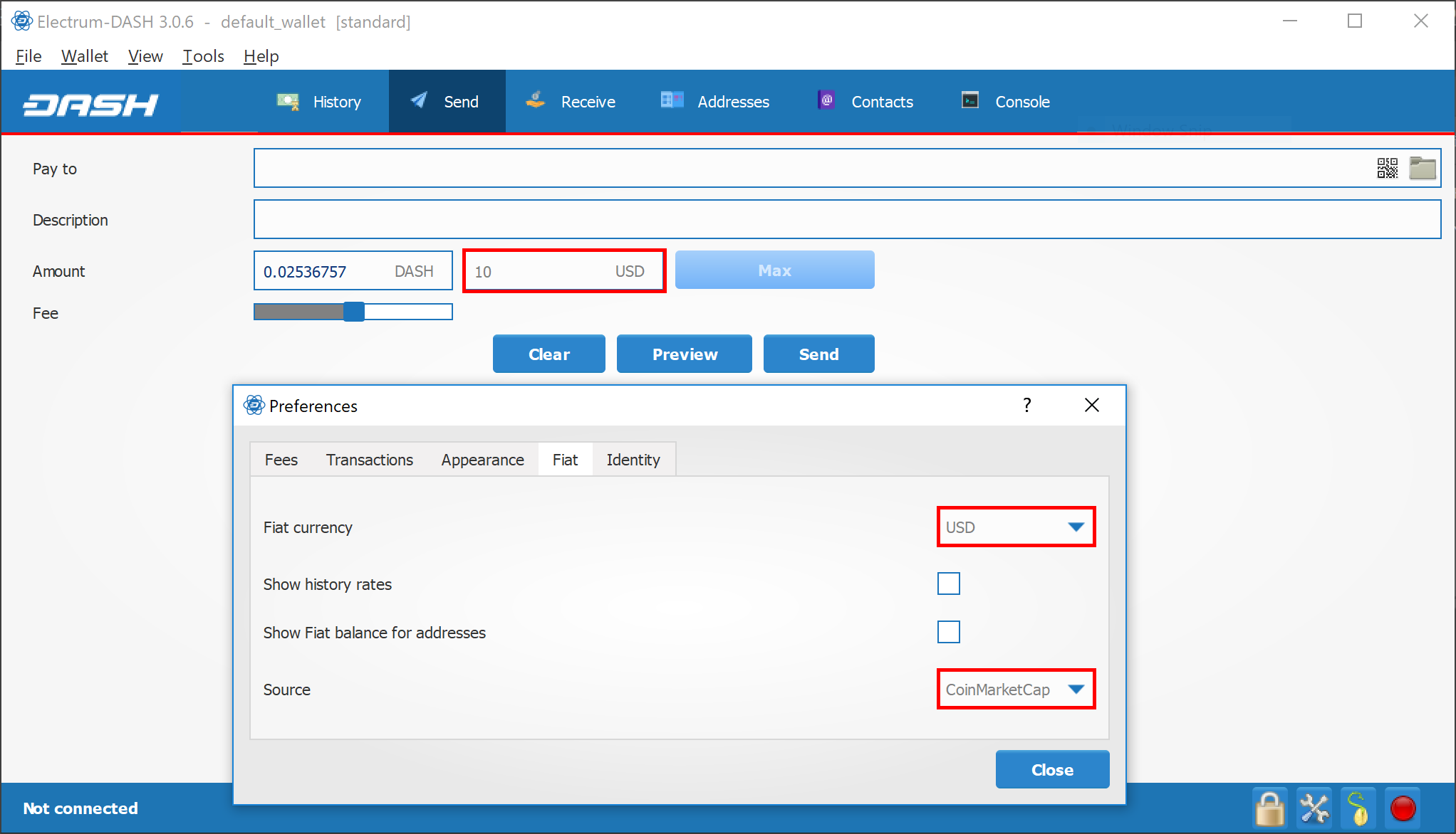 Entering values in fiat currency in Dash Electrum#