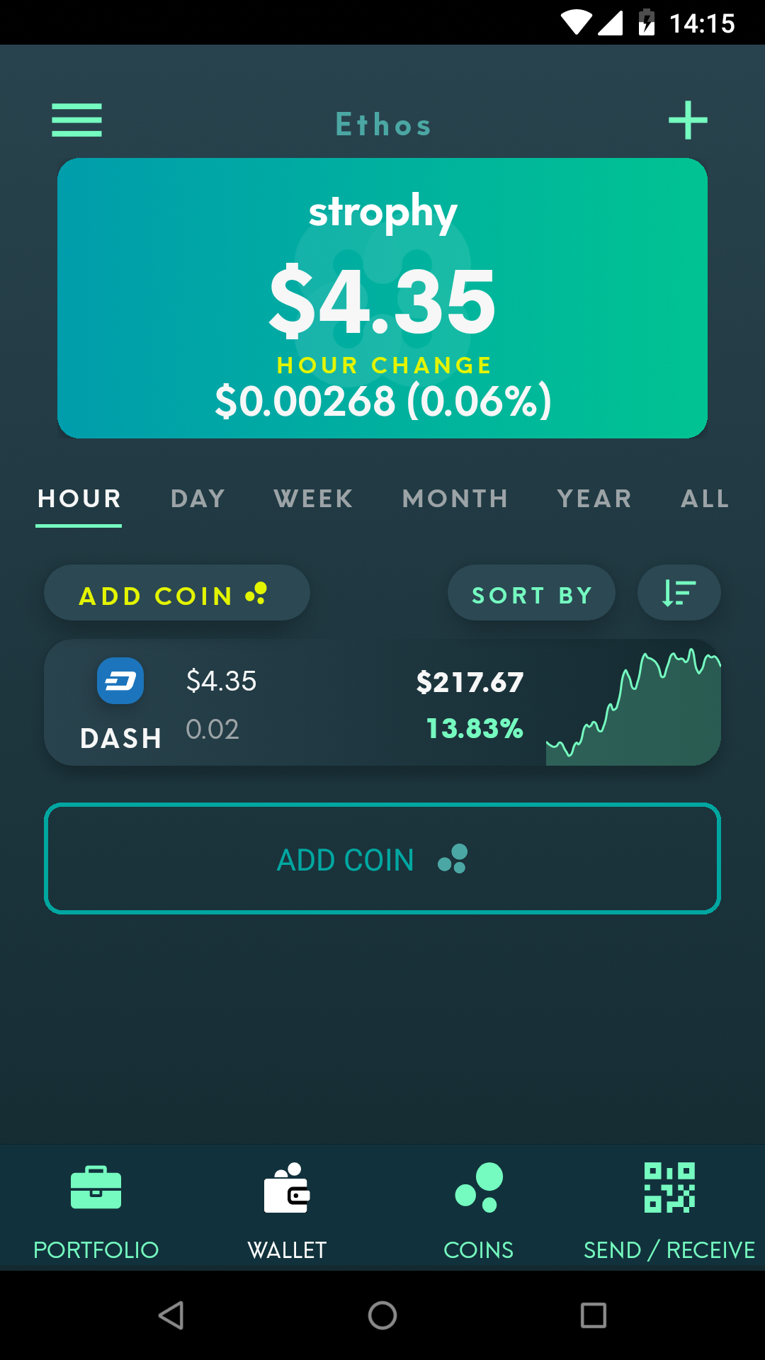The Ethos Universal Wallet allows you to store Dash and over 100 other cryptocurrencies. It features a single recovery phrase, known as the SmartKey, with which you can restore all balances on another device. Features include human-readable usernames, ShapeShift coin conversion and a portfolio tracker.
